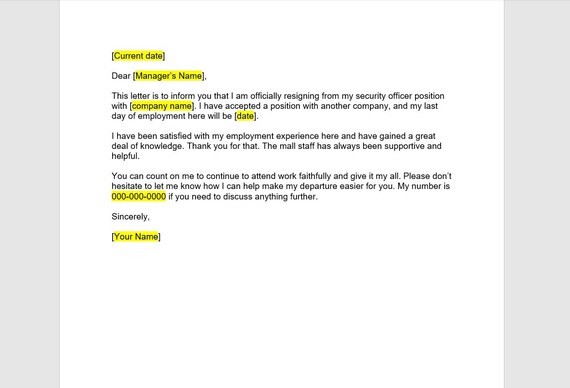 Security Officer Resignation Letter Template Resignation Letter Resignation Template Resignation Letter Template Word Template Etsy