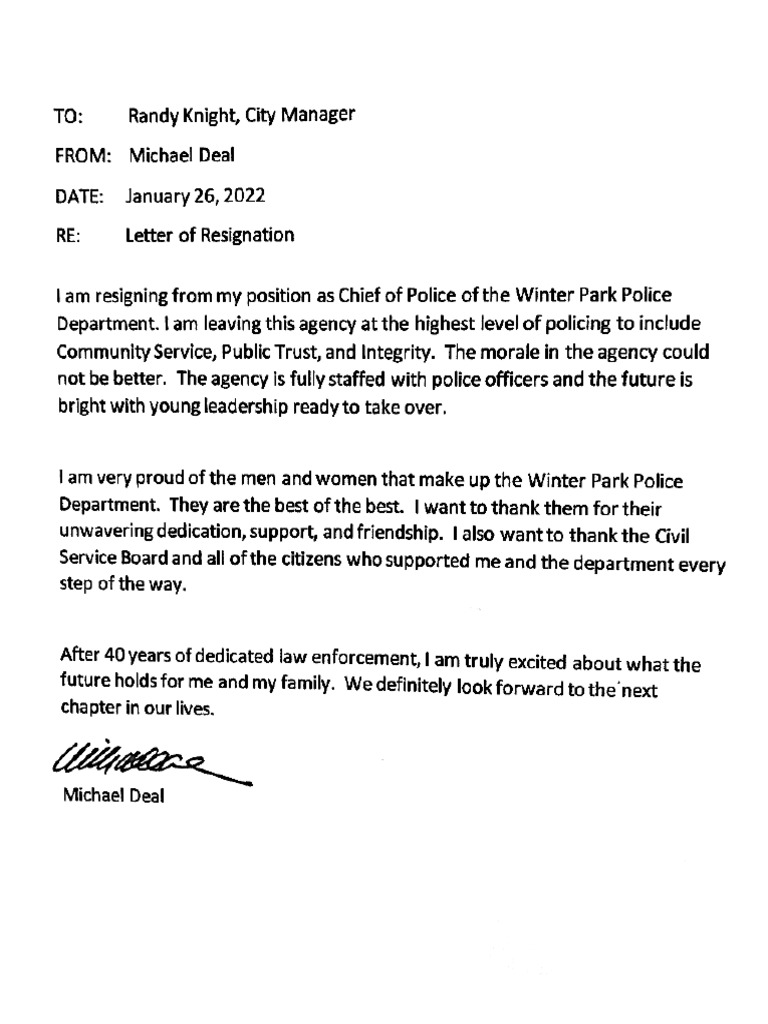 Michael Deal Letter Of Resignation 01 26 22 Pdf